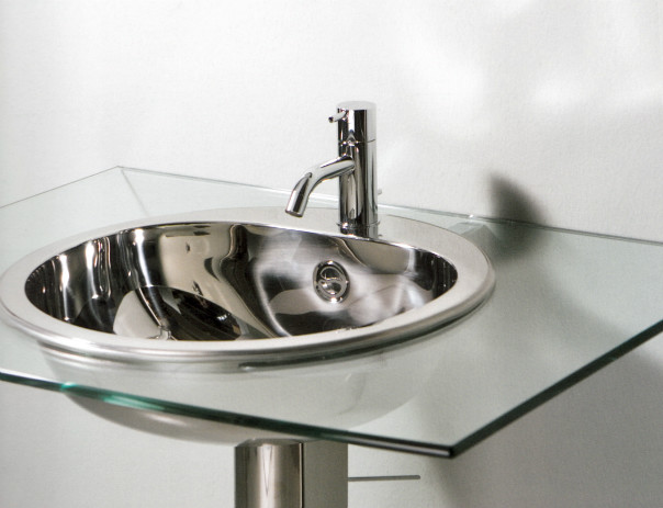 Mit einer gehärteten Glasfläche, klar oder einbrennlackiert, wird das Becken zum eleganten Waschtisch.